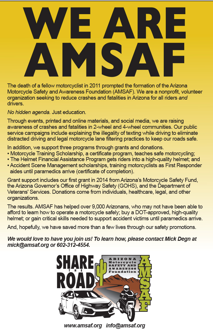 The working relationship between AMSAF, Governor’s Office of Highway Safety and Arizona Motorcycle Safety Fund is a huge opportunity to help educate the motorcycle community through the AMSAF motorcycle training scholarship.