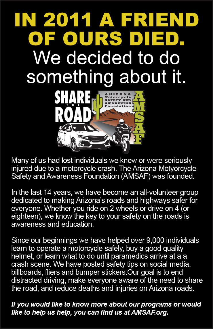 Arizona has more than 300,000 registered motorcycles, which continues to grow. According to GOHS, the number of motorcycle and distracted driver crashes and fatalities have increased, resulting in the creation of the Share the Road effort. AMSAF’s vision is to foster a safe, motorcycle-riding/driver-friendly environment for all.