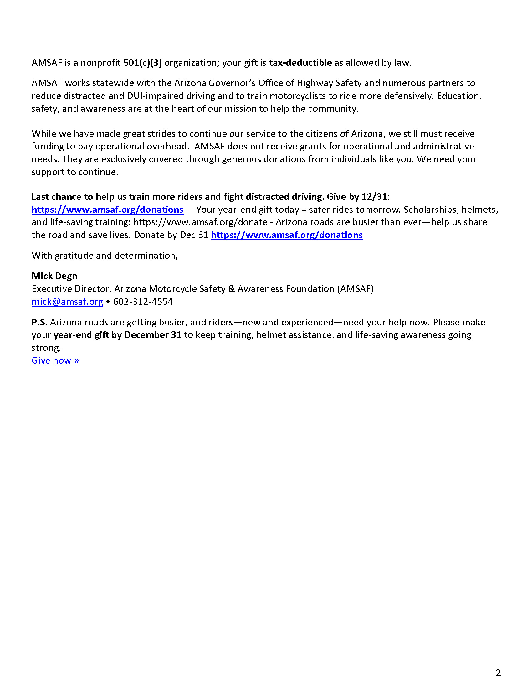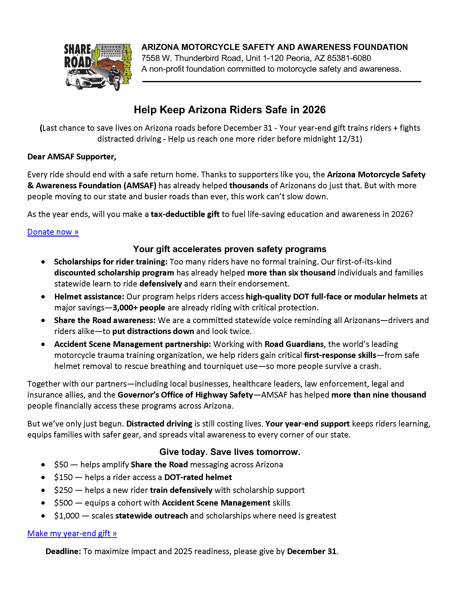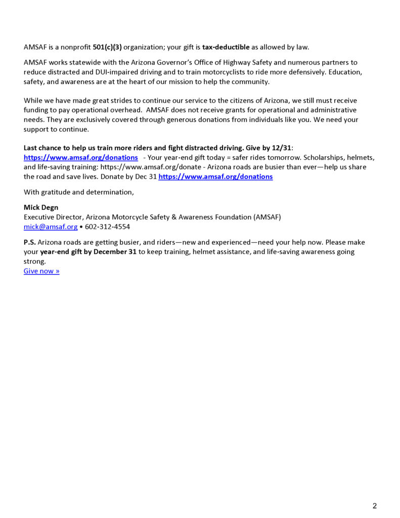 P.S. Arizona roads are getting busier, and riders—new and experienced—need your help now. Please make your year‑end gift by December 31 to keep training, helmet assistance, and life‑saving awareness going strong.